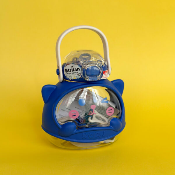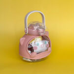 Botella con sorbete, correa desmontable y plancha de stickers.