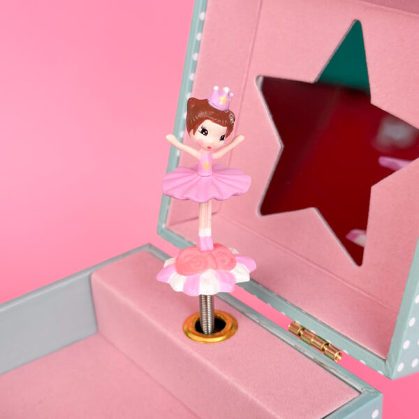 Al girar la manivela y abrir la tapa, una dulce bailarina aparece danzando frente al espejo, acompañada de una suave melodía que llena el ambiente. Un objeto especial para decorar, regalar o disfrutar en la infancia.