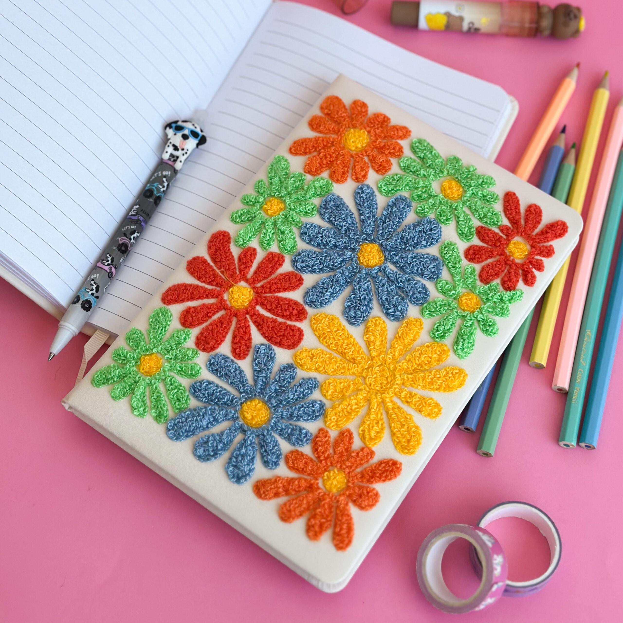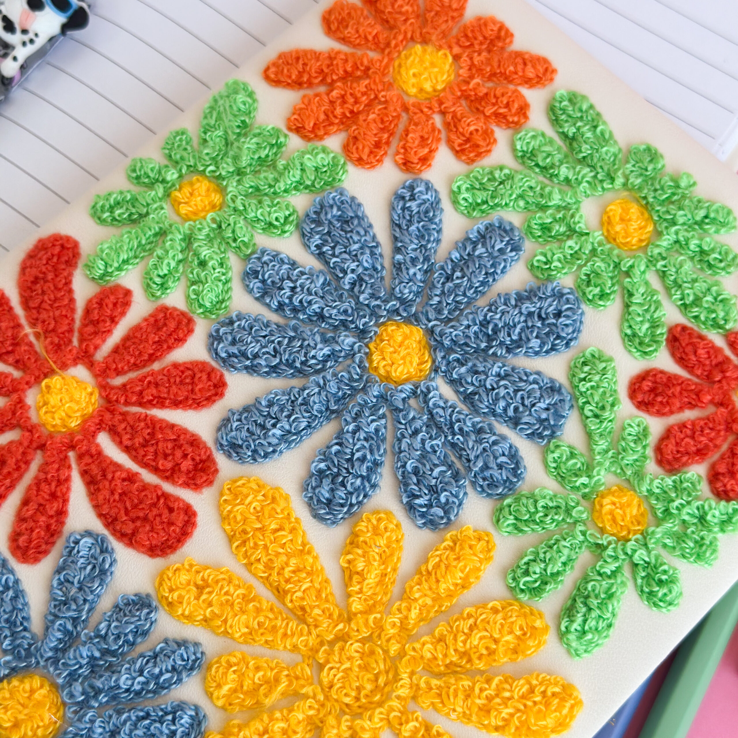 Cuadernos con tapa bordada en relieve y delicados diseños de flores de colores.