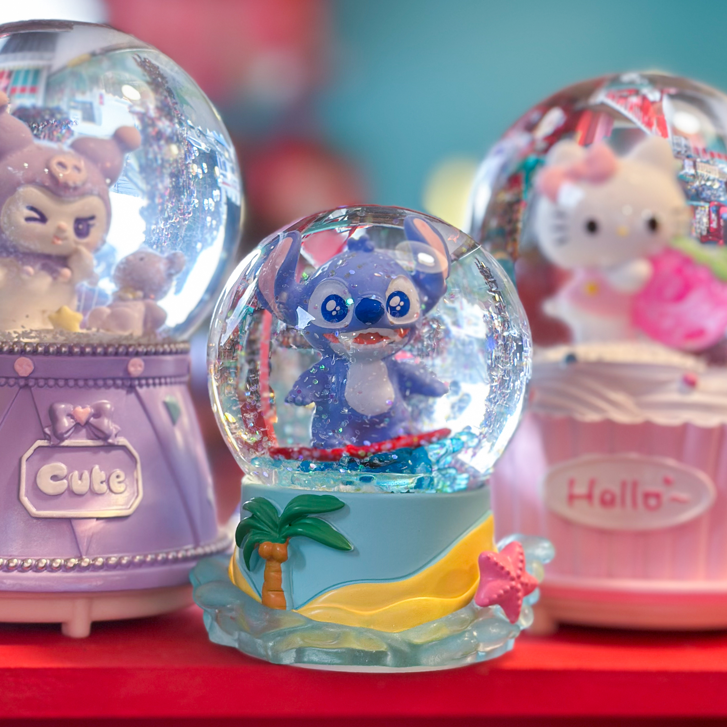 Esferas de cristal con luz de personajes de Stitch, Capibara y Totoro.