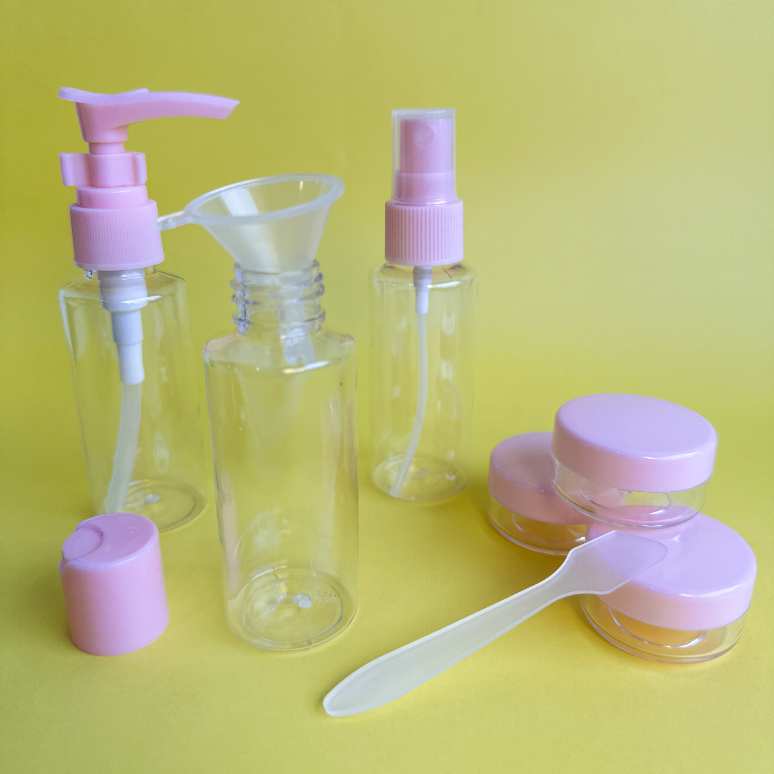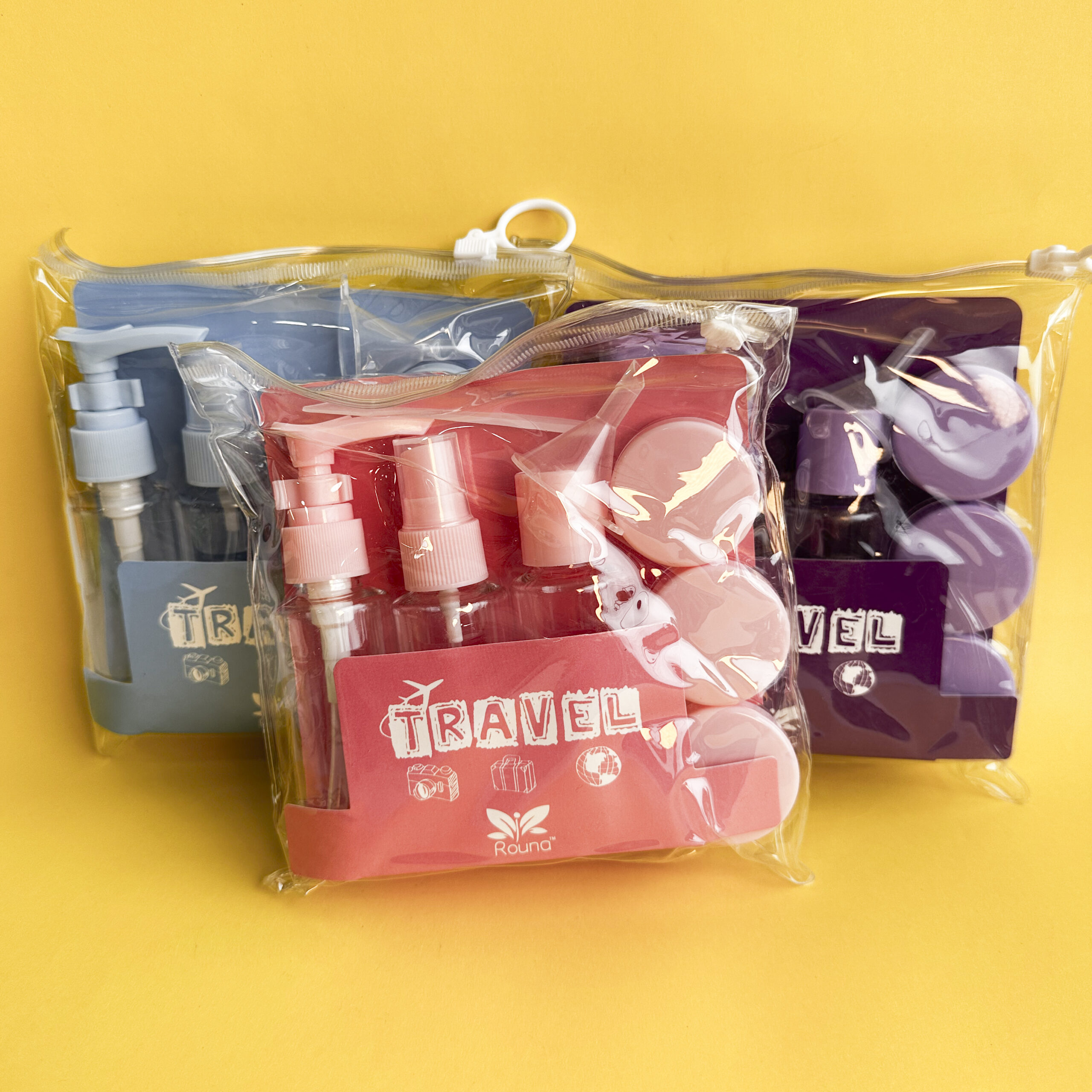 Kit de viaje con 6 envases recargables de 50 ml, fabricados en plástico liviano y resistente.