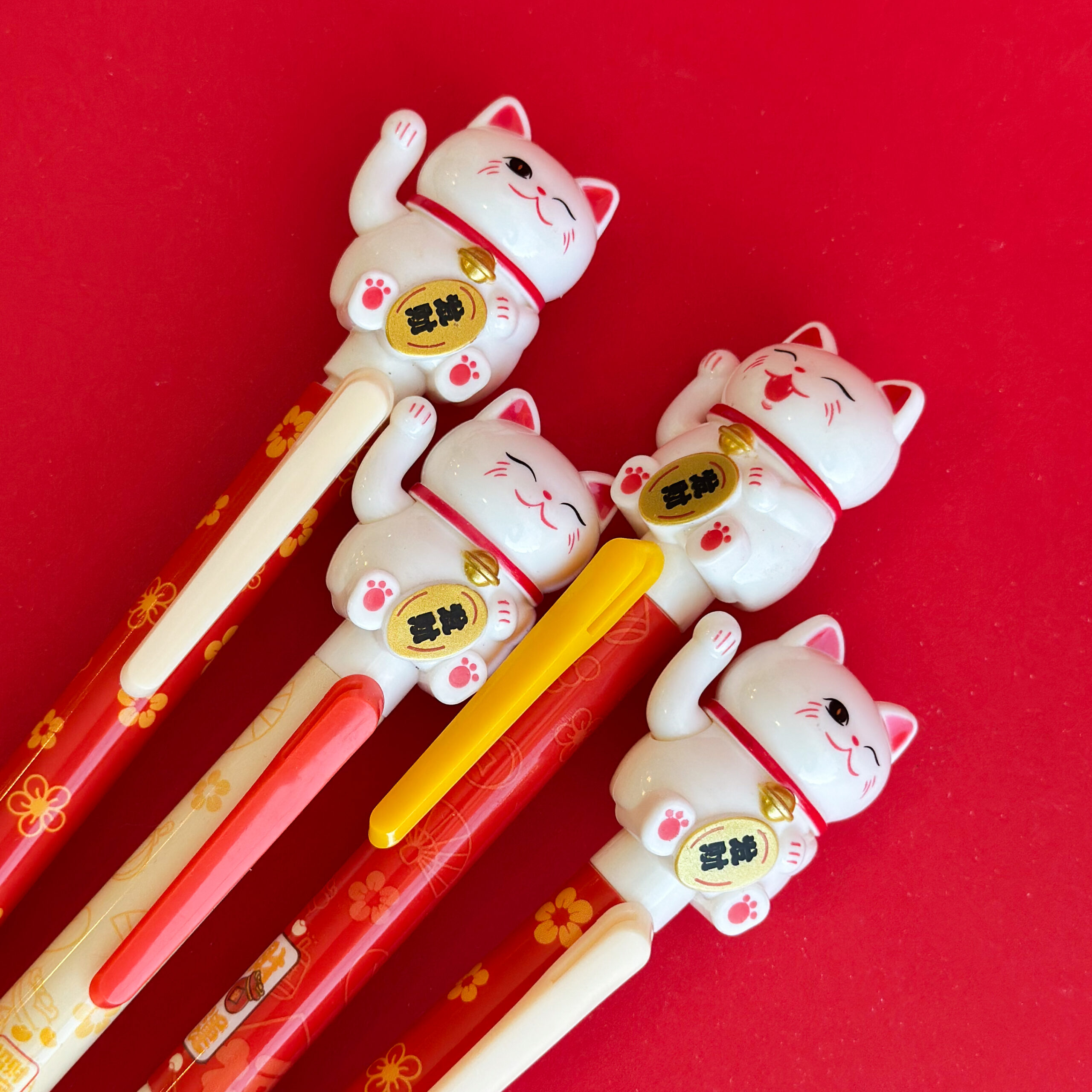 Sumá un toque de buena suerte y ternura a tu escritorio con esta lapicera Maneki Neko. Su diseño oriental clásico presenta al gatito de la fortuna que, al bajar la lapicera para escribir, mueve su muñeca saludando, haciendo de cada uso un pequeño momento divertido.