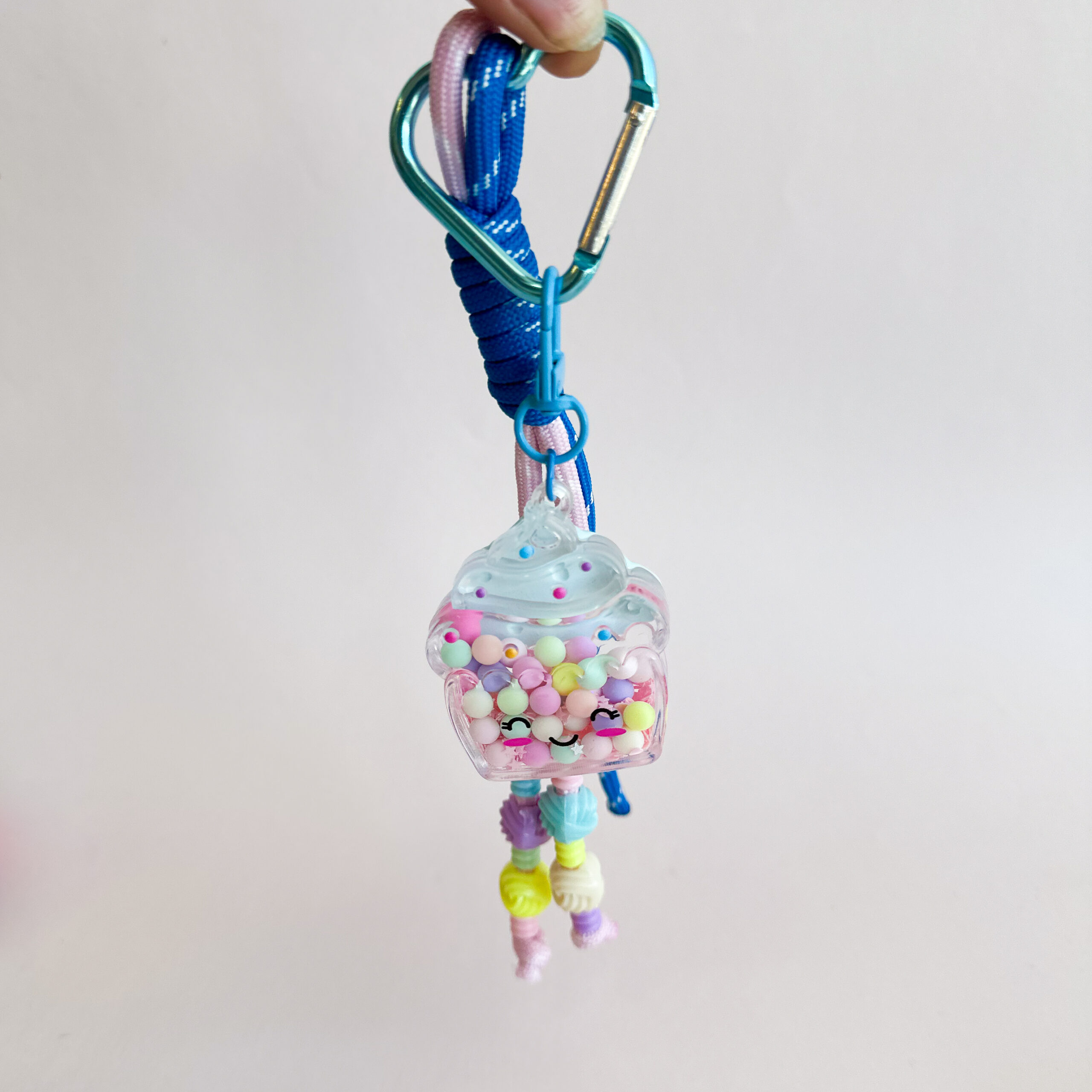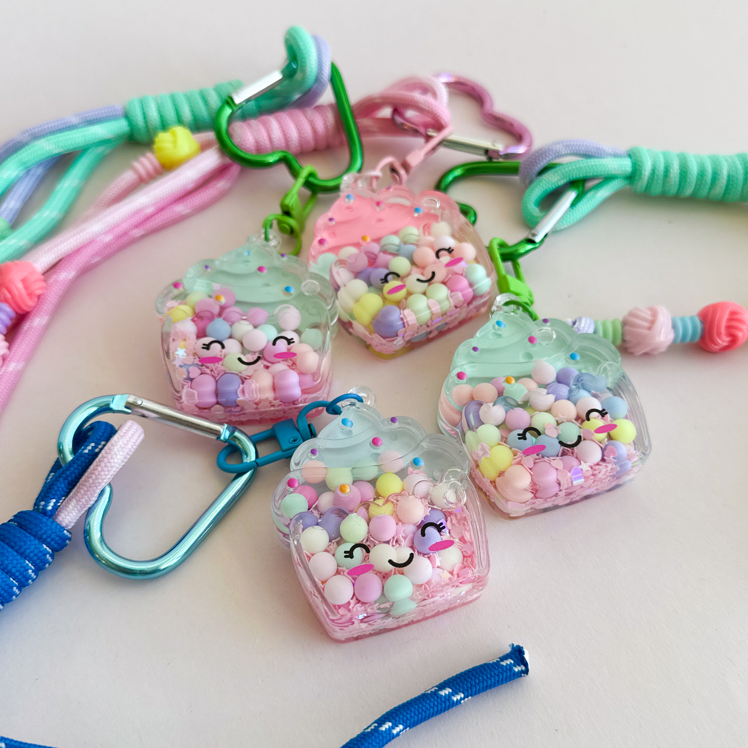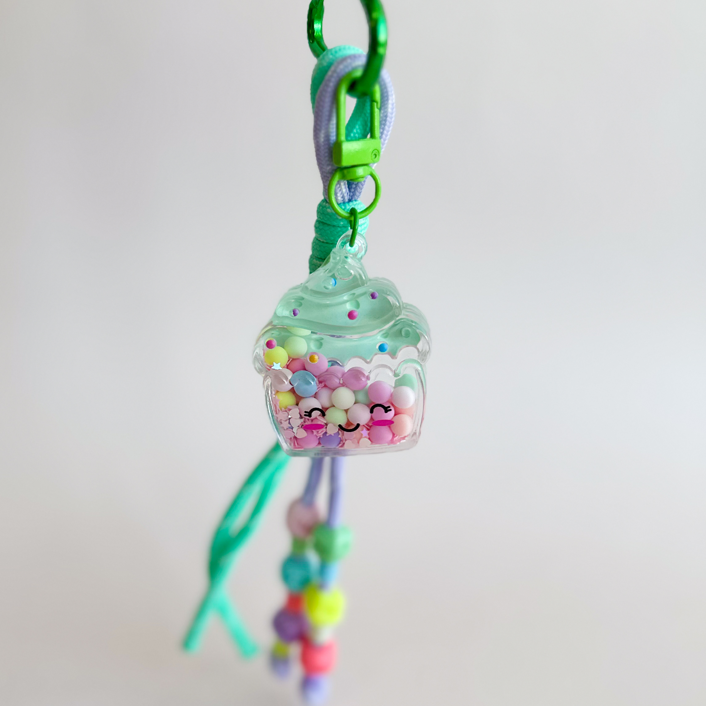 Un llavero dulce y divertido con dije en forma de cupcake que incluye cuentas de colores en su interior, creando un efecto llamativo y original.