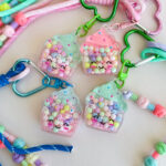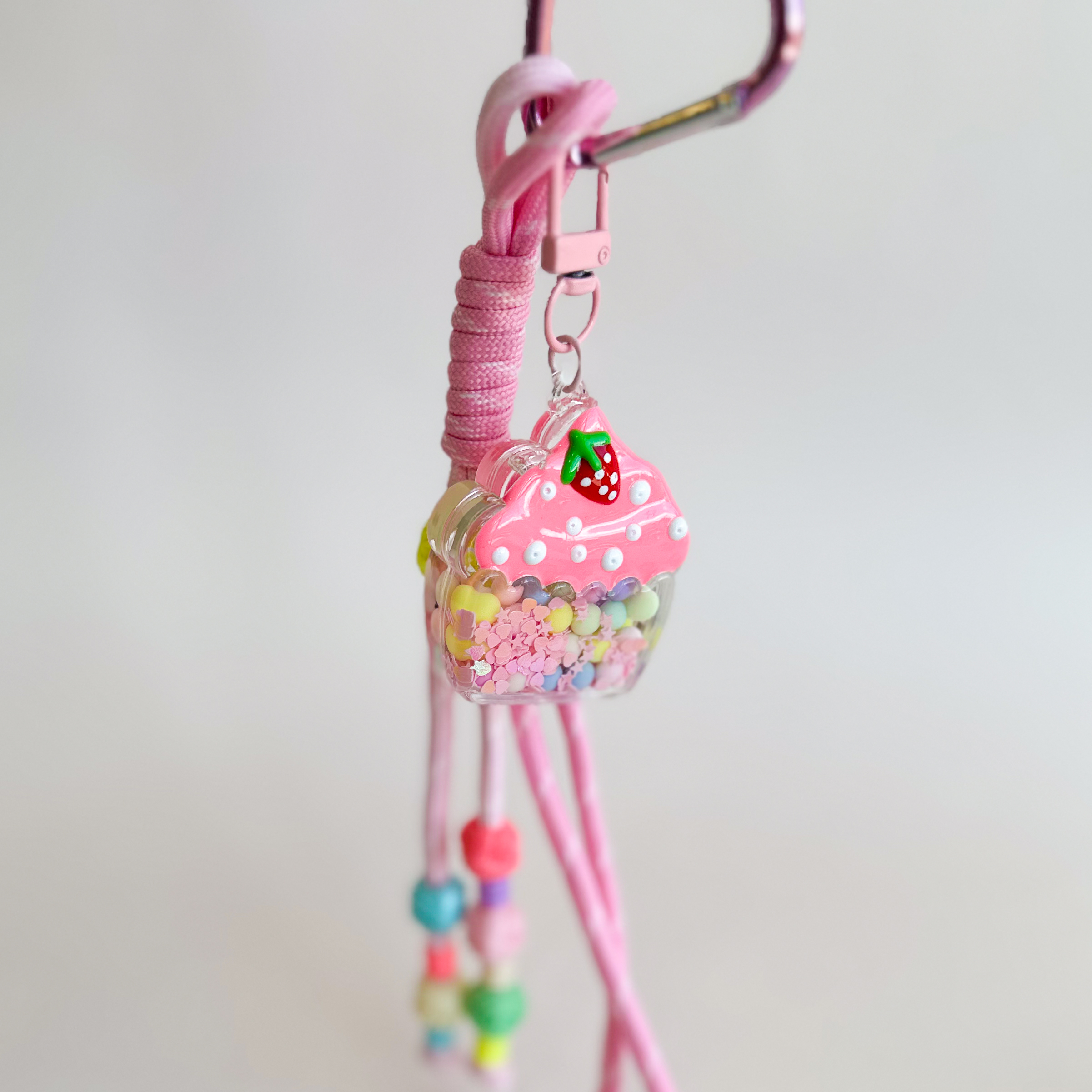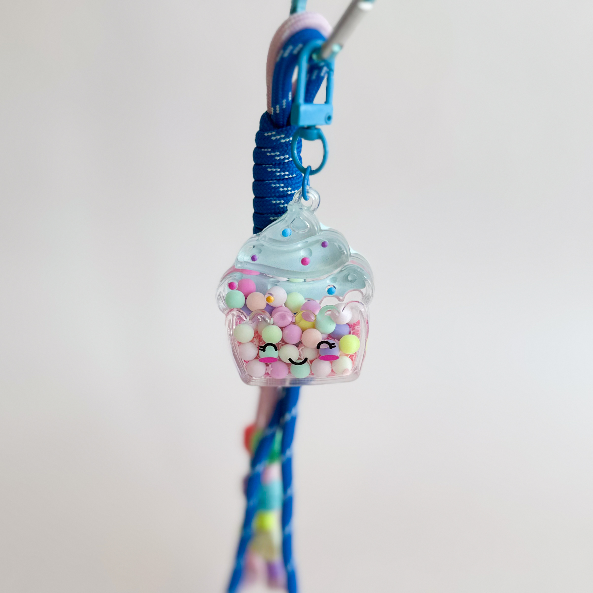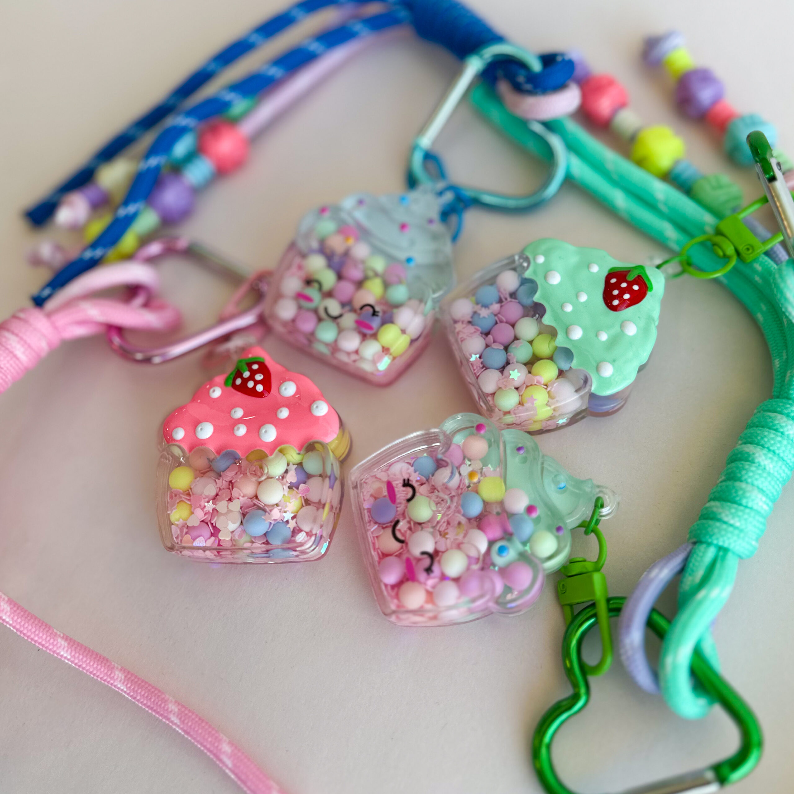 Un llavero dulce y divertido con dije en forma de cupcake que incluye cuentas de colores en su interior, creando un efecto llamativo y original.