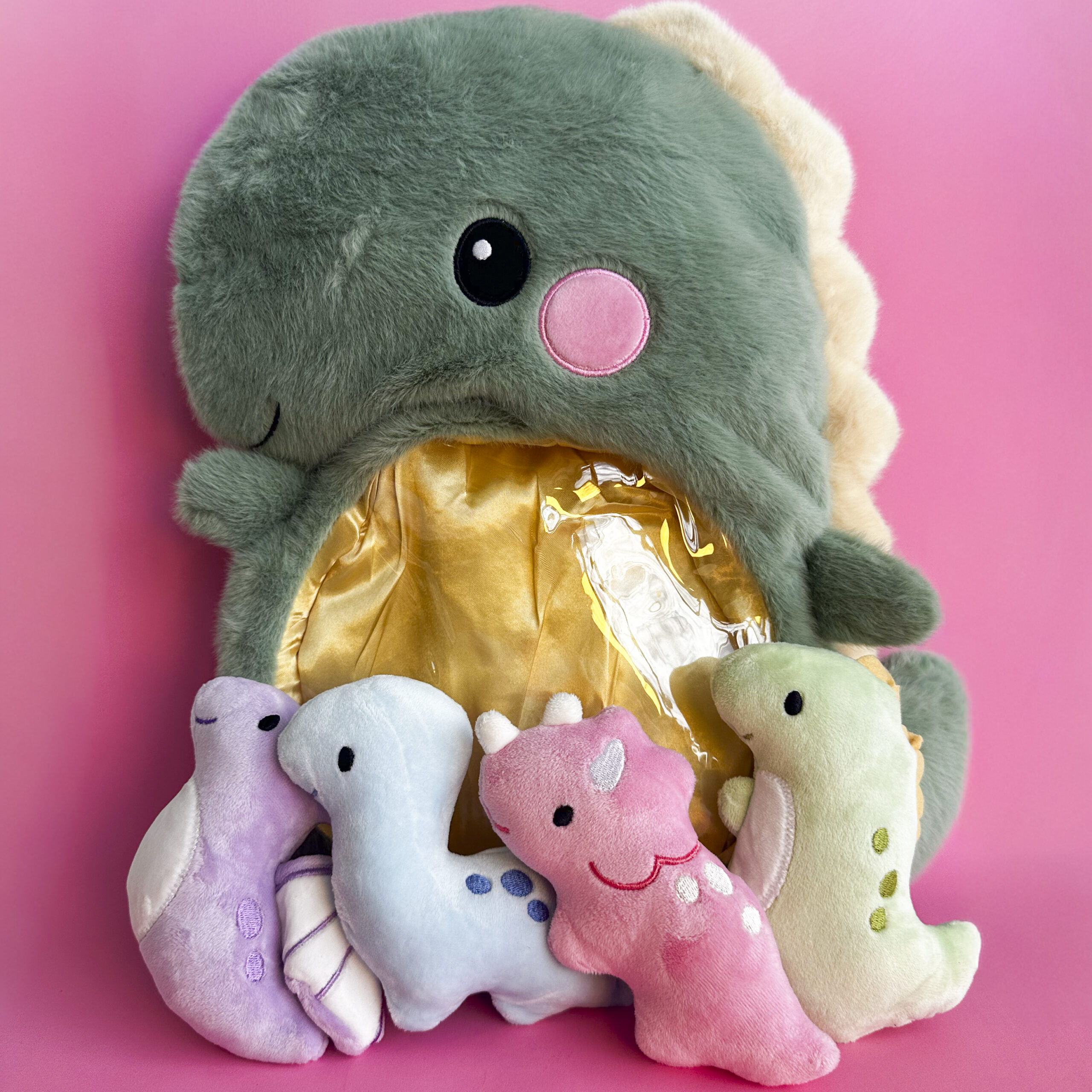 Este peluche de dinosaurio tiene peluches más pequeños guardados en su pancita.