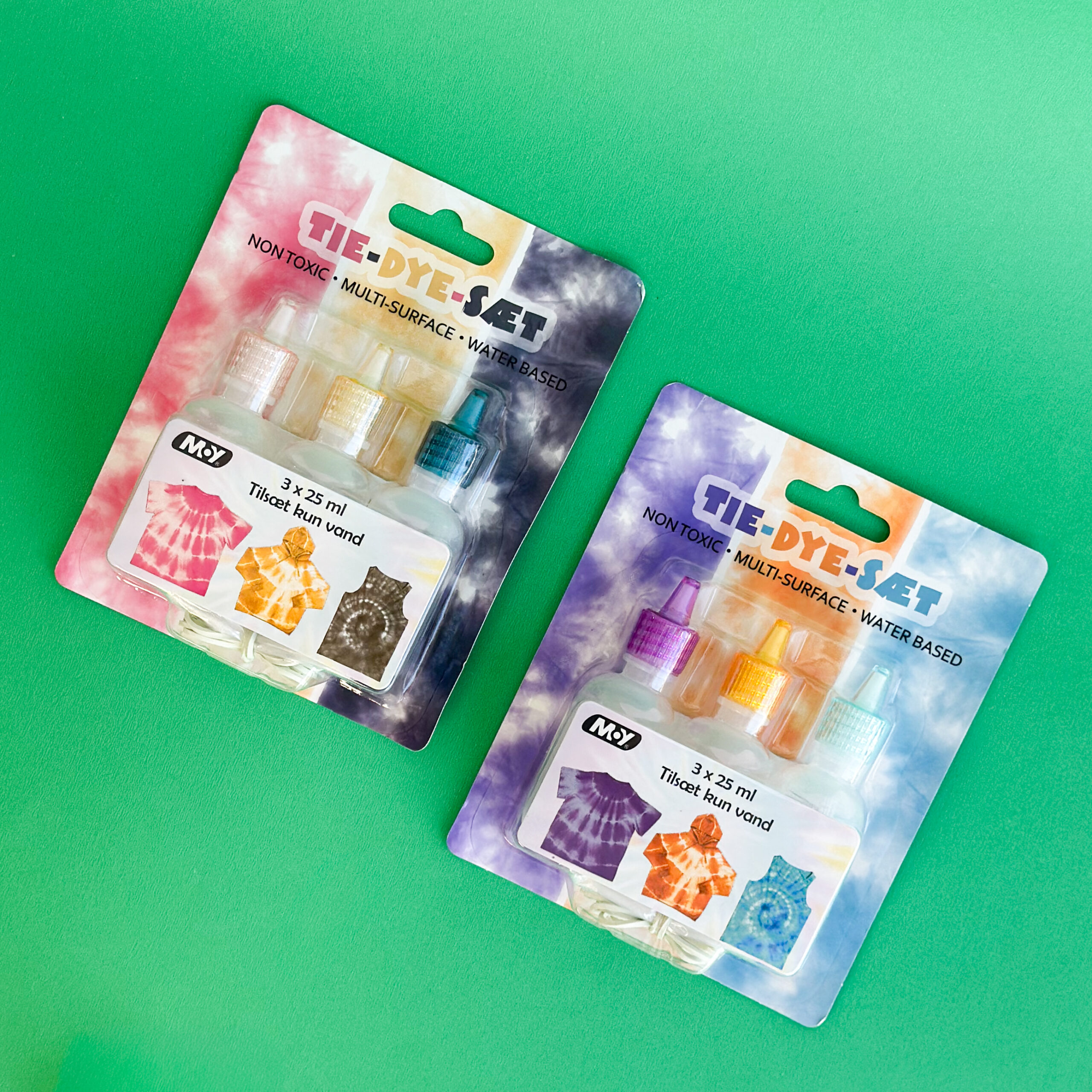 Set de tintes Tie-Dye para crear diseños únicos y divertidos en tus prendas y accesorios. Cada kit incluye 3 botellas de color (25 ml c/u) listas para usar: solo necesitás agregar agua.