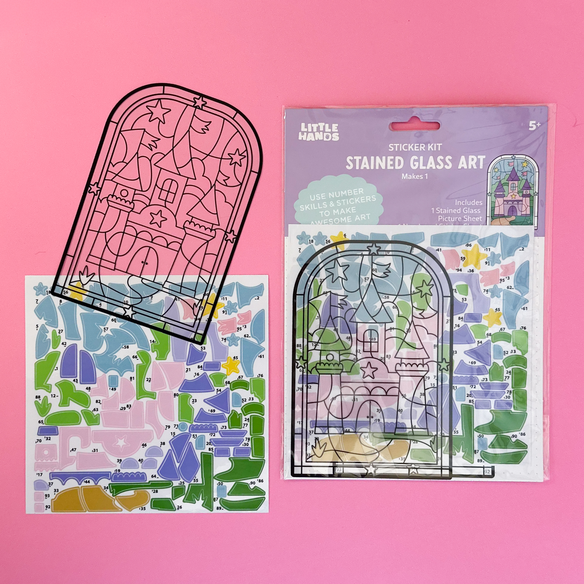Creá tu propia obra de arte estilo vitral de manera súper simple y divertida. Solo tenés que pegar las pegatinas transparentes siguiendo los números guía en la parte posterior del paquete.